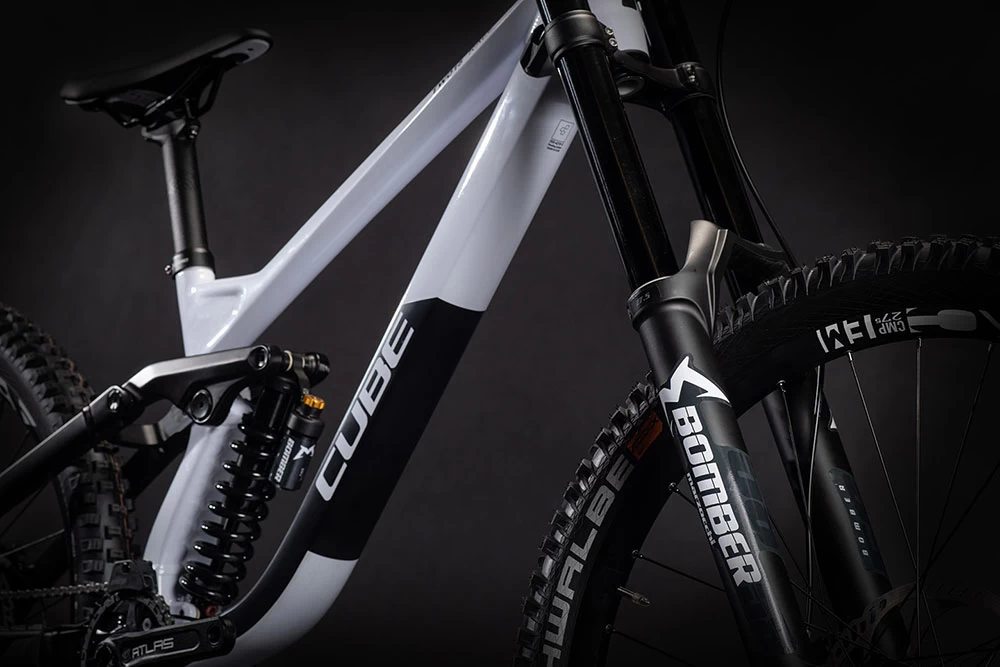 Wer im Downhill Zirkus unterwegs ist, kennt die Bomber Komponenten – Synonym für kompromisslose Qualität und höchste Performance. Und genau deshalb hat Cube beim Cube Two15 Race dem Marzocchi Bomber CR Dämpfer eine Bomber 58 FIT GRIP Federgabel zur Seite gestellt: die ultimative Kombo für geschmeidige, superprogressive Kontrolle am Berg.