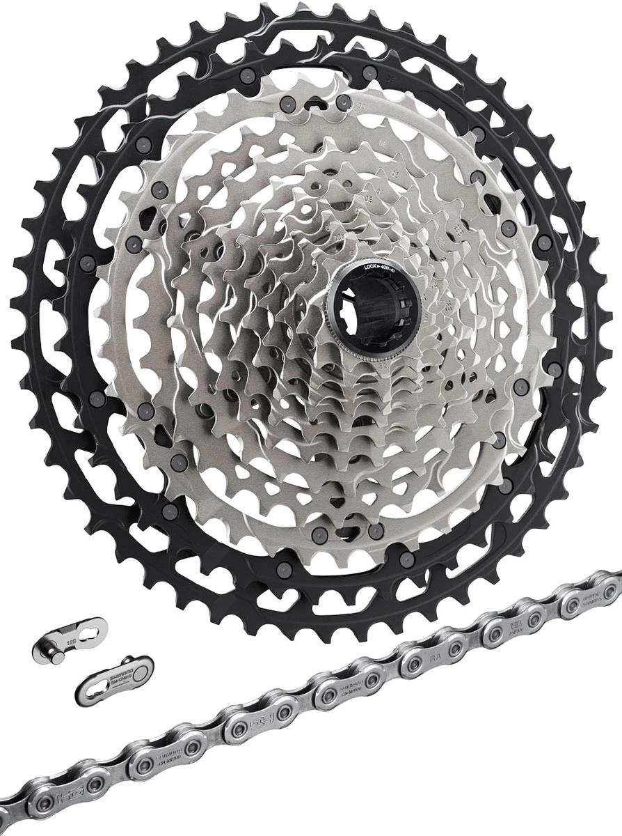 Verschleissset für Shimano 12-fach Antrieb bestehend aus der XT CS-M8100 Kassette in verschiedenen Abstufungen und der XT CN-M8100 Kette mit 126 Gliedern. Der ebenfalls neue SM-CN910-12 Quick-Link-Verschluss ermöglicht die einfache Montage.